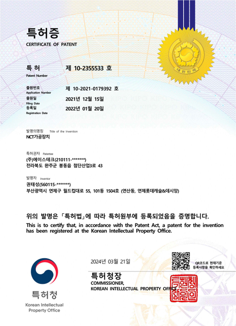 특허 제 10-2355533 호
