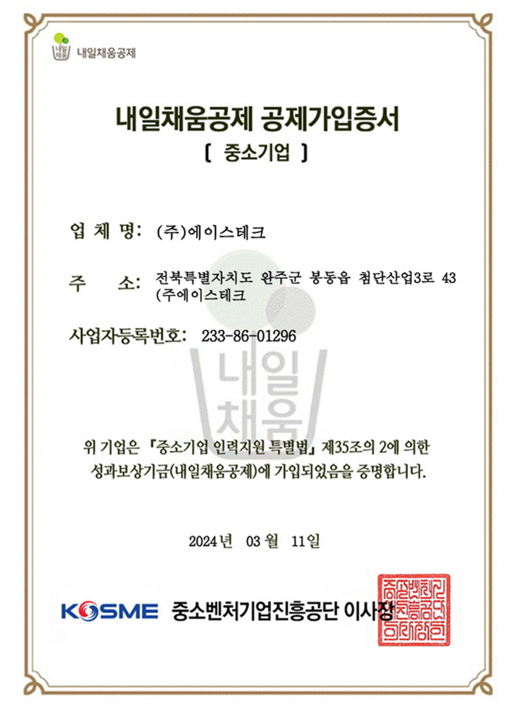 내일채움공제 공제가입증서